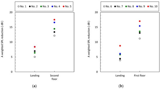 A-weighted SPL reduction at each measurement point. (a) Sound source position: first floor; (b) Sound source position: second floor.