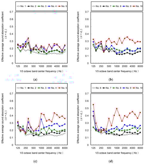 where R is the room constant for specimen No. 1 or No. 6, R2 means the room constant for specimens No. 2–5 and No. 7–10, LD is the relative sound pressure level shown in Figure 8, is the improvement in the average sound absorption coefficient. By substituting Equations (4) and (5) into Equation (3), the effective average sound absorption coefficient is obtained.