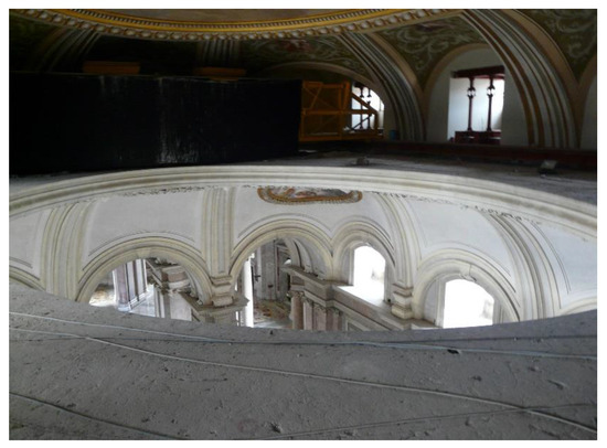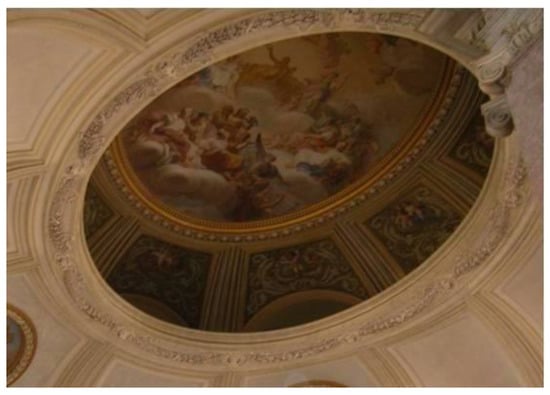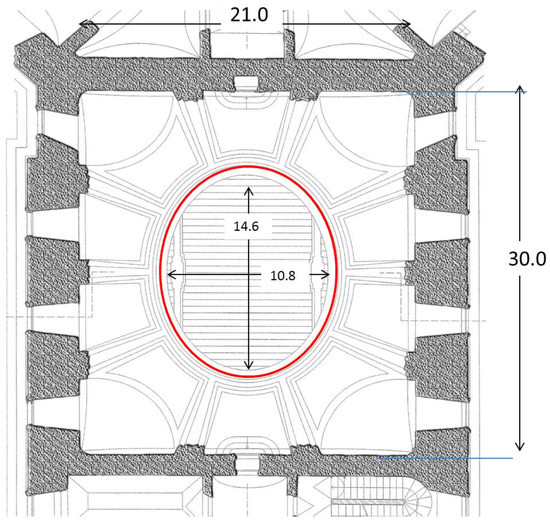 Inside the Royal Palace, the Grand Staircase connects the lower vestibule to the upper vestibule, making possible entry to the Royal apartments. The Grand Staircase is overlooked by a double vault with an elliptical opening (Figure 1 and Figure 2). The double vault has two caps, with the lower assuming the role of a large oval cornice. A similar architectural solution was widely used for the realization of domes. Generally, the first dome was blunt, with the upper dome having more points of view for the structural requirements and the weights on the horizontal structures being stabilized. In the 16th century, numerous projects showed the realization of double vaults and domes [3,4]. Double-dome structures were used for the dome of St. Paul’s Cathedral by Christopher Wren in London as well as the dome of Les Invalides in Paris, where Mansart developed three caps in 1680. The double-cap model was widely diffused in Italy too, as proved by the dome of St. Maria of Flower in Florence, as well as the dome of St. Peter’s church in Rome.