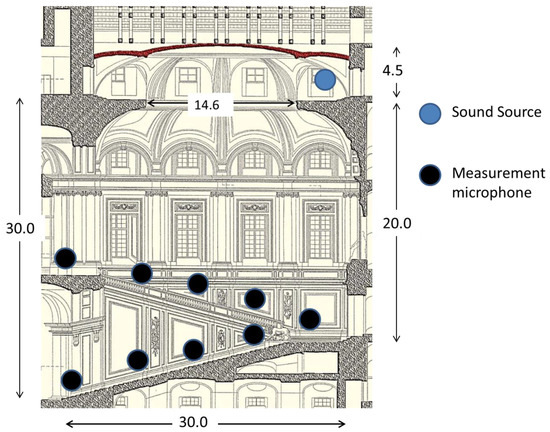 All the acoustic measurements were taken under unoccupied conditions. Figure 5 shows the section of the grand staircase and double vault, with the 16 receiver positions and the position of the sound source in the double vault. Due to the symmetry of the space and to the double set of stairs, each microphone position on the stairs indicates two points of measure on each stair ramp. The acoustic measurements provided the values of the impulse responses that were processed with the Dirac 4.0 software to calculate the values of the acoustic parameters (EDT, T30, C80 and D50) in the octave bands from 125 Hz to 4 kHz.