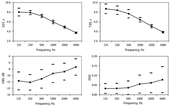 Figure 6 reports the measured values of EDT, T30, C80, and D50, averaged among the fifteen receiver locations, together with the intervals of the standard deviation for each band from 125 Hz to 4.0 kHz. These parameters have been defined in order to better describe the perception of a sound field, even though their prediction depends on many factors, such as the relative position of the sources and receivers. Using recent studies on the typical listening preference, the criteria established in [12] were used to assess the results of the acoustics of this space. The results suggested that the hall is over-reverberant and not well suited for chamber music or for speech perceptions, given its low speech intelligibility. In particular, the clarity assumes values that are well below those suggested for the sound perception, which confirms the condition of the sound envelope that the listeners experienced without having a clear perception of its direction.