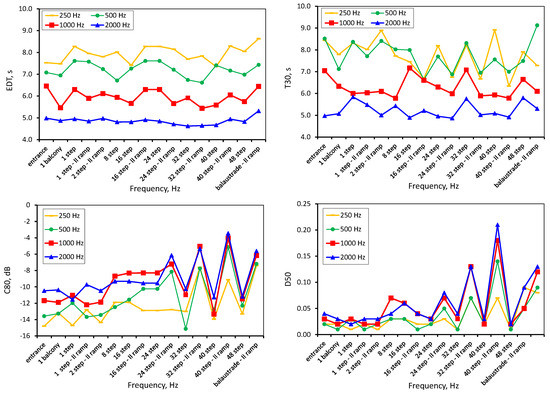 The values of the standard deviations are higher for T30 and EDT, while they increase with the frequency for the early-to-late energy distribution parameters (C80 and D50). This means that the values of these acoustic parameters change significantly from point to point, as evident in Figure 7, as a result of the change in the source-receiver distance. The measured reverberation time was about 8 s at low frequencies and about 6 s at middle frequencies. The measured T30 and EDT times are long due to the large volume of the room, which encloses the staircase, and to the presence of the plastered surfaces of the walls and marble floor, which are acoustically reflective.