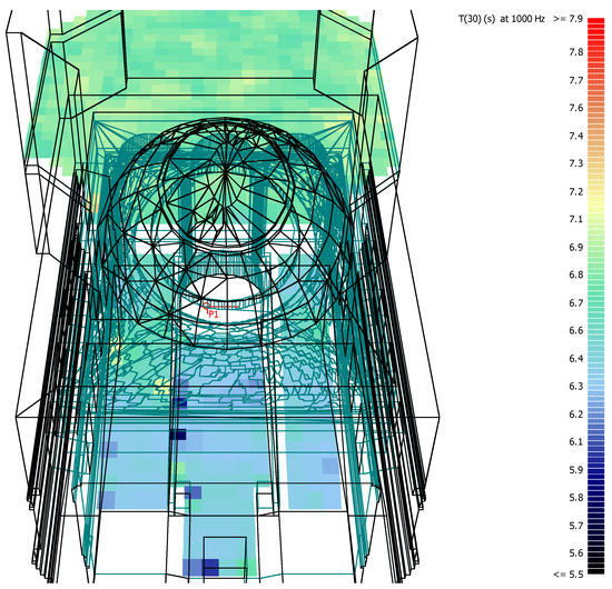 Spatial distribution of reverberation time (T30) in the octave band of 1 kHz.