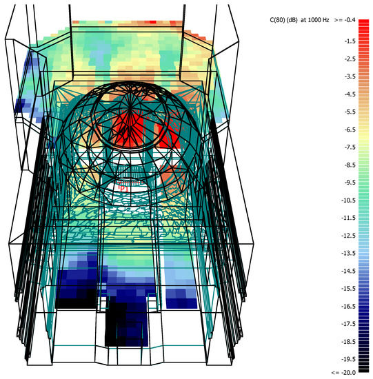 Spatial distribution of clarity (C80) in the octave band of 1 kHz.