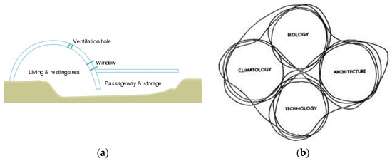 (a) Igloo construction, with the compact of snow to insulate the interior where is warmed by body heat alone [17]; (b) Interlocking fields: Bioclimatic Design [18].