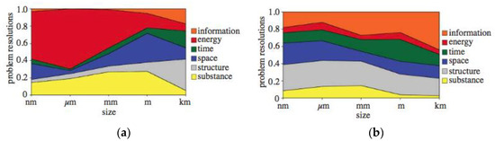 (a) The types of problem-solving strategies that human technology employs on different length scales [26]. Technology tends to function by manipulating energy and substance; (b) Types of effects observed in biology at different length scales [26]. Natural systems tend to function on account of how they are structured and the way information is managed.