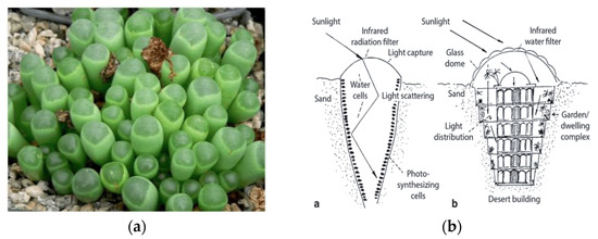 If we look at all design solutions based from nature and compare with problem-solving contradiction in architectural design, one can find many commonalities between the two domains. For examples, the main purposes for windows are to allow light in and to let you see out and this often comes at the expense of their ability to prevent heat transfer. The contradiction is what if the building requires more light inside and at the same time the building must be able to control heat gain, how can we solve this contradiction within the same design concept? Once we look at the perfect solution in nature, in general we recognize that plants have many techniques for light harvesting, but what about one that can also control heat gain. One such example is Fenestraria aurantiaca (also known as window plant) [28]. Window plants have a similar working principle to fiber optics, it can be found in the deserts of South Africa, they are nearly buried in the sand [29]. The tip of every leaf is transparent: Light enters here and can travel down the leaf [29]. The plant shown in Figure 3a has only a small part of it exposed to the light. The plant absorbs light through an opening at the top, hence the name ‘window plant’. Fenestraria aurantiaca has specialized adaptations to deal with heat, light and aridity. The window at the top of the plant is actually a light transparent membrane, light can protrude through this membrane to reach the lower region of the leave. The mechanisms from Fenestraria aurantiaca not only inspire cooling and light collections, but could also provide a feasible solution for architecture design. The concept of the window plant can be adapted for building in deserts and very hot regions (Figure 3b). The light collection combined with cooling effect could open new doors to building design. The concept of light collectors has been in existence for a long time and is constantly optimized. The fact that architectural design itself could provide light collection and cooling, without the need of additional systems, could result in sustainable building design.