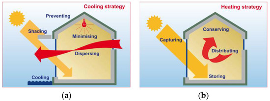 (a) The cooling strategy, reduce calorie intake and promote refreshment; (b) The heating strategy promotes free heat gains and reduces thermal experts, while allowing sufficient air renewal [37].