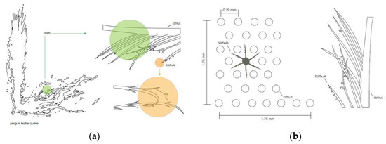 (a) Feather structure of penguin [41]; (b) Feather distribution on penguin [41].