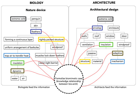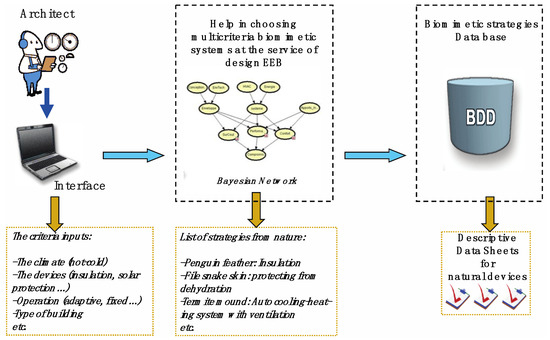 The goal of this study is to create a tool to search for and bridge the relationship between natural devices and architecture. We propose to create a platform to formalize the knowledge between biology and architecture along with investigating tools that assist architects what biomimetic strategies to choose and to explore further according to multi-criteria requirements (e.g., type of operation, structure, scale, climate classification, time, comfort summer or winter, etc.). Furthermore, the platform of the tool will help to save time during initial stage of exchanging knowledge between biologists and architects, as the tool can help to find the link between the two domains according to their common design concepts and phenomena interacting with their environmental conditions [43]. While the role of biologists is to feed the database on biological knowledge and the role of architects is to feed the architectural design knowledge in parallel (Figure 7). After formalizing the relationship of the two domains, multi-criteria choice assistance and decision-making tool could be introduced according to specificity in each project. In this article, we have hypothetically suggested the Bayesian network as a testing result in serving energy-efficient building design.
