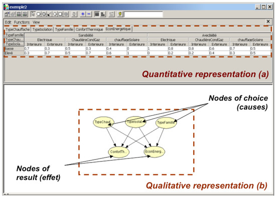 The first interest of proposing the Bayesian network is that it could be used in domains where knowledge is not explicit and difficult to control. A Bayesian network permits identification of the relationships between pieces of information about the project that could appear independently [46] as the relation between type of users and energy performance [47] (Figure 9). The second interest of the BN is that it can be used in the two directions: from effects to cause (information given, Figure 10) and from causes to effects (decision-making aid, Figure 11). Thus, it is possible to evaluate the effects of causes or to find out the possible causes of a given effect. To be shown in Figure 10 and Figure 11.