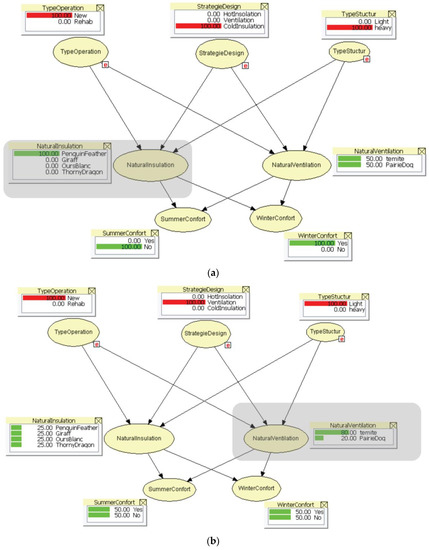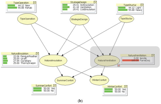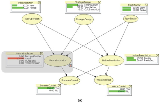 We propose presenting how the tool will run through this small network (Figure 10 and Figure 11). The network presented in these figures consists of 7 nodes (or variables). It will help to identify ventilation and insulation strategies from nature (2 nodes), which respond to particular indications or constraints. These responses will be based on three nodes of inputted information: the type of operation, the design strategy and the type of structure. It will also provide guidance or against-indications related to comfort, summer and winter (two nodes). These nodes are connected, cause and effect, through directed arrows. Indeed, if we take the case of identifying an insulation strategy for example, we know that the choice of type of insulation inspired by nature depending on the type of operation (renovation or new construction) and robustness of the structure. We also know that this choice can be adapted or not to the summer/winter comfort, depending on the case. Each node representing a variable that can have multiple attributes (or states): variable comfort summer, for example, has two states: positive (Yes) or negative (No), the probability of being checked is varied from 0% to 100%. This network can be used from top to bottom, or from bottom to top as follows: