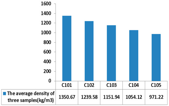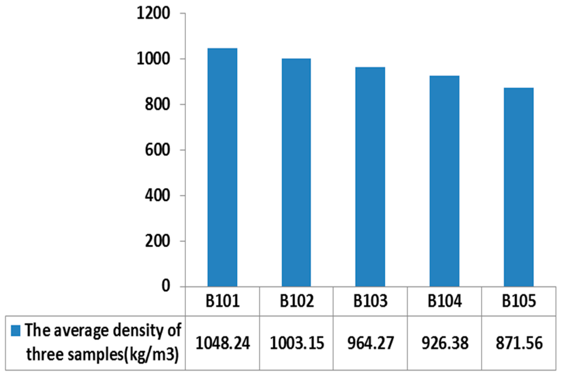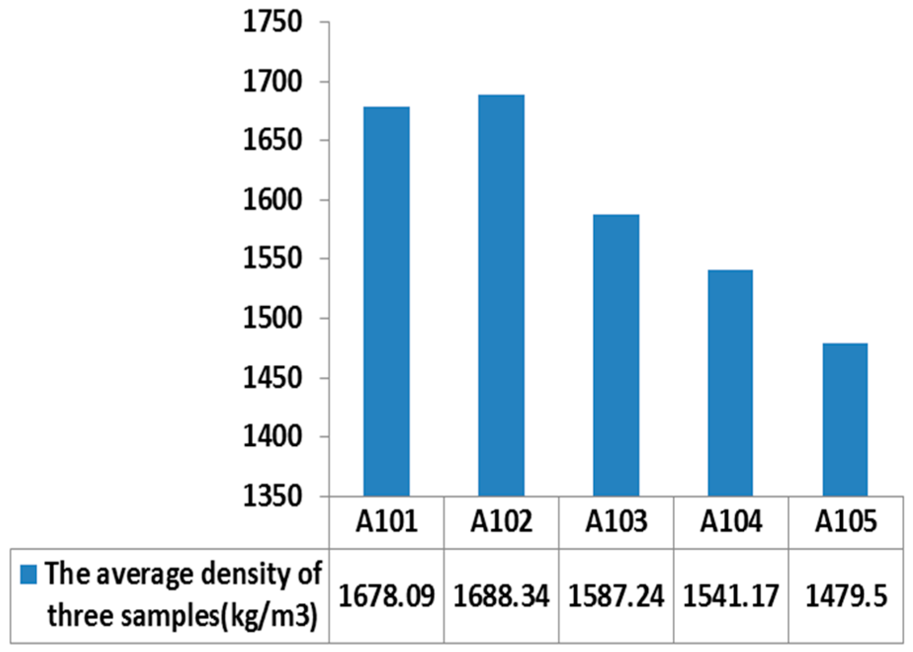 Density is calculated using Equation (1), and its water absorption is obtained using Equation (2) (Standard 70-2) [22]: