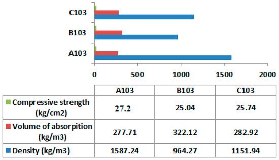 Comparison chart of compressive strength, density, and water absorption volume of lightweight aggregate blocks with optimal mix.