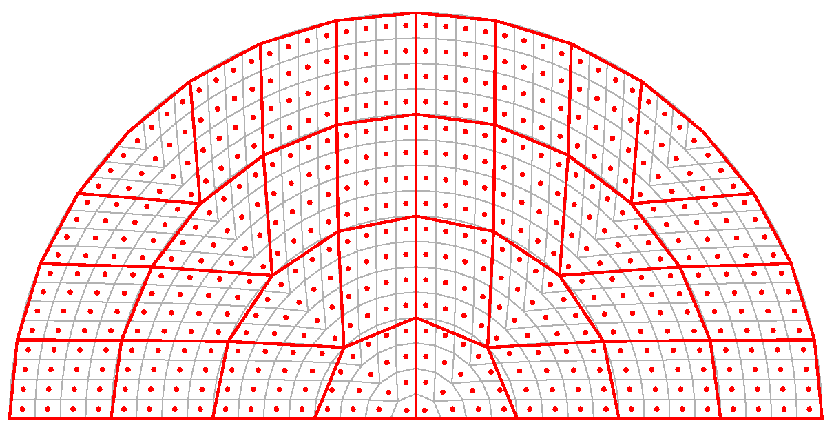 The parameterizable directional basis allows one to store BSDFs at different resolutions. However, the computational combination of BSDFs according to Equation (3) is only defined for matrices of identical size. A sampling strategy must be therefore chosen to combine BSDFs of different resolution and generate a BSDF of given target resolution. The size of all matrices employed in the calculation is set according to the target resolution. The BSDF of each layer is down- or up-sampled accordingly when the matrices are created. For cases where the target resolution of BSDF is higher than the resolution of the input layer BSDF, clusters of neighboring coefficients will share an identical value. If the resolution of BSDF is smaller than that of BSDF, proper sampling must ensure that, e.g., sharp peaks in the input BSDF are not missed. In the current implementation, all coefficients of the high resolution dataset contained in one patch of the target dataset are sampled and averaged. Figure 2 shows the sampled directions, which equal the center points of the high resolution dataset and the low resolution patches of an exemplary target resolution. Adaptive oversampling of the BSDF would reduce computational expense, but add complexity to the implementation.