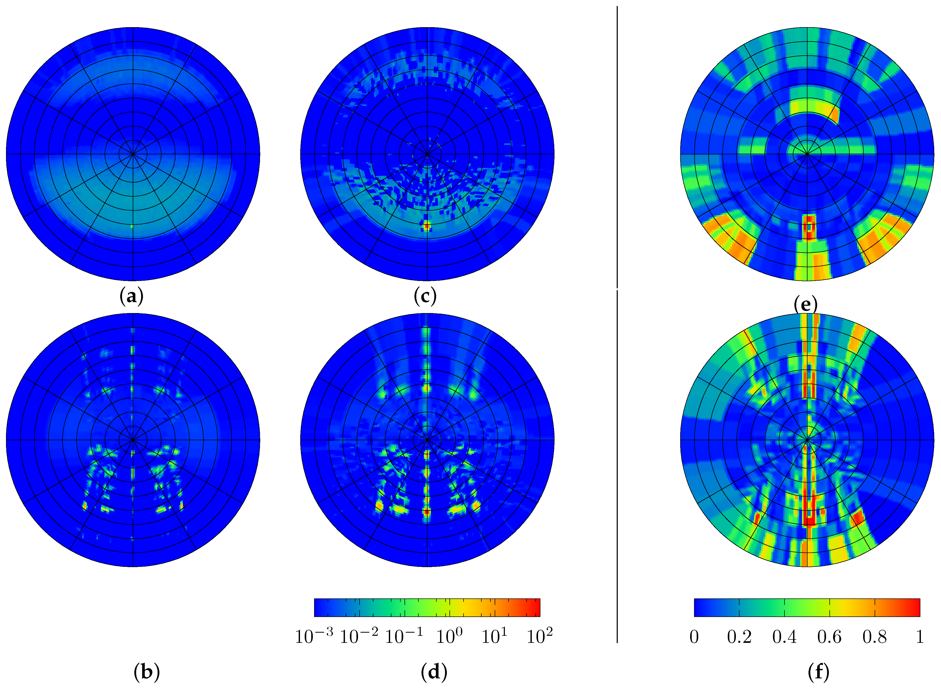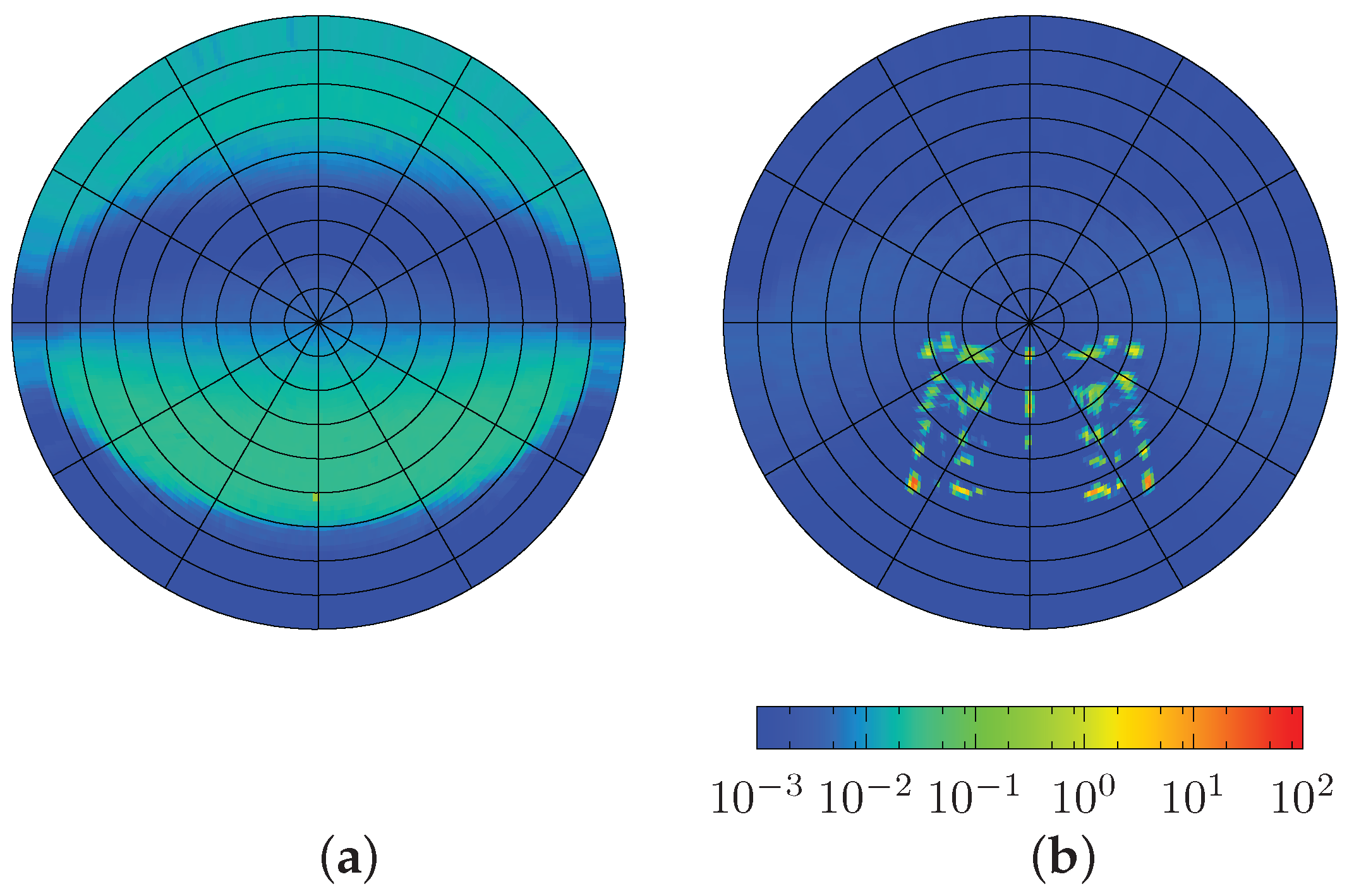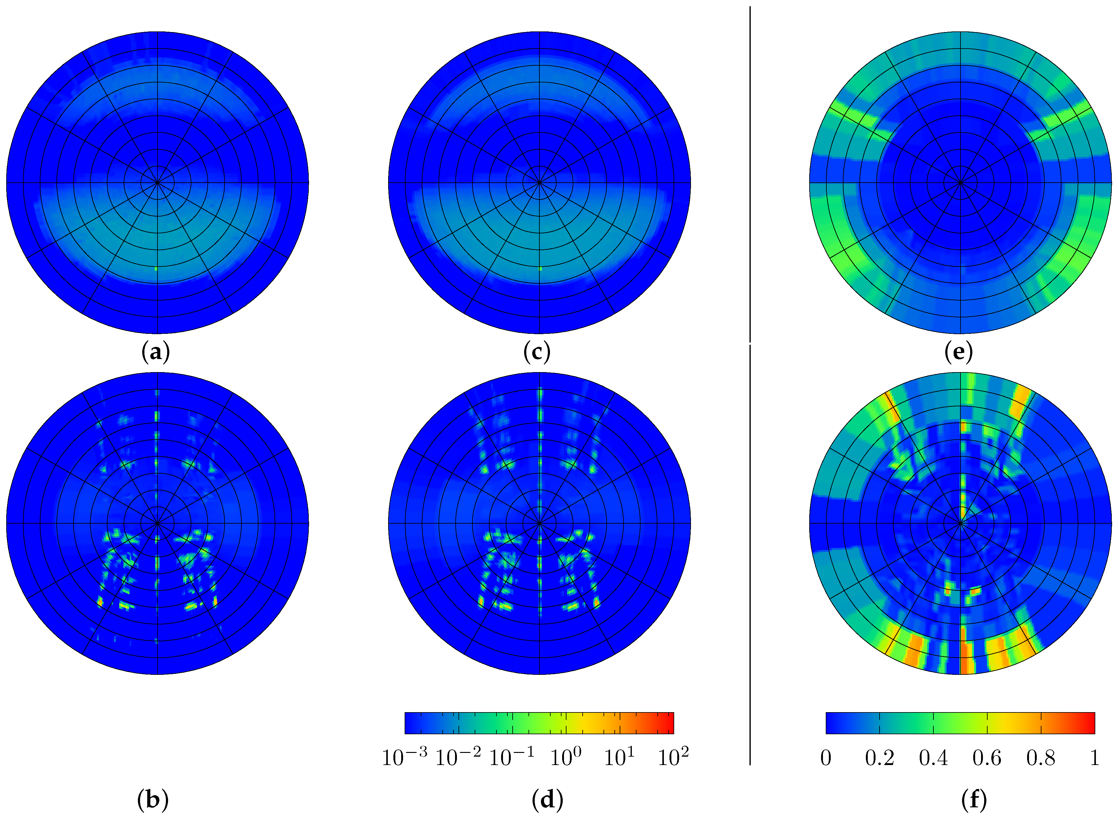 Global Accordance (GA) and Local Accordance (LA) are applied to compare the two DSFs of a CFS for one given incident direction [37]. These metrics are based on the pair-wise comparison of values for identical directions. If a sharp peak is accurately predicted for a direction minimally offset from the peak direction in the reference, this good accordance would not be accounted for because of the mismatch of peak directions. To reduce the sensitivity of the comparison to such slight directional mismatches, the resolution of both distributions is reduced (from to ) before the application of the metrics. This step merges 16 adjacent directions and thereby avoids artifacts due to sharp peaks and high frequency noise.
