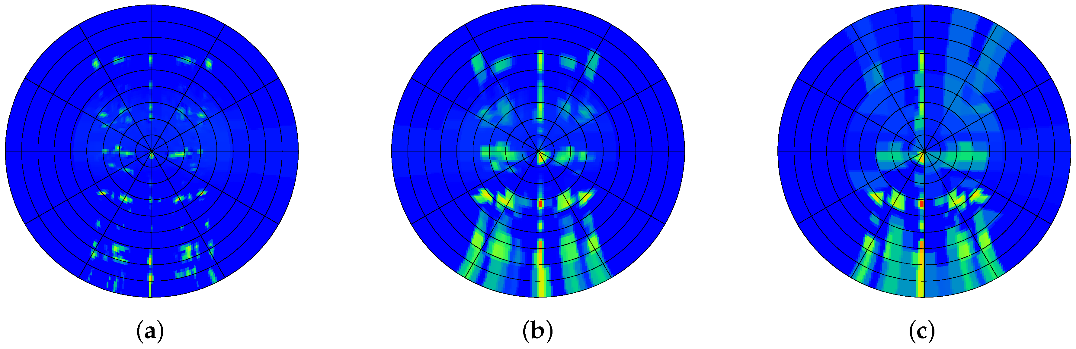 Comparison of ray-traced and down-sampled transmission distributions of CFS2 for incident direction : (a) Ray-traced at high resolution (). (b) Down-sampled from (a) to moderate resolution (). (c) Ray-traced distribution with resolution as (b).