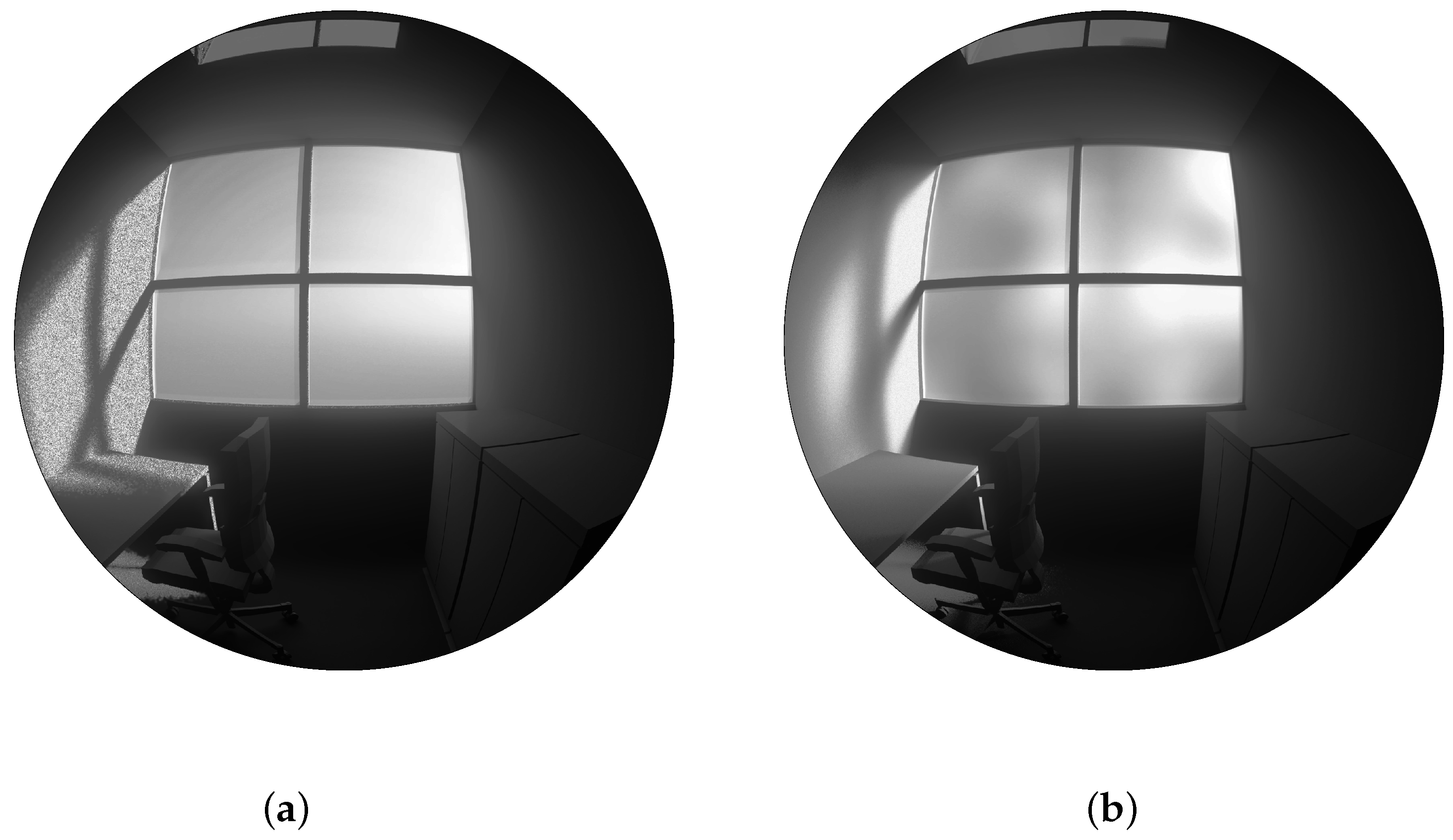 View of an occupant. As in Figure 10, CFS1 is modeled by combining BSDFs based on the Shirley–Chiu algorithm (a) and Klems basis (b). The different directional resolutions affect the luminance distribution within the field of view significantly.
