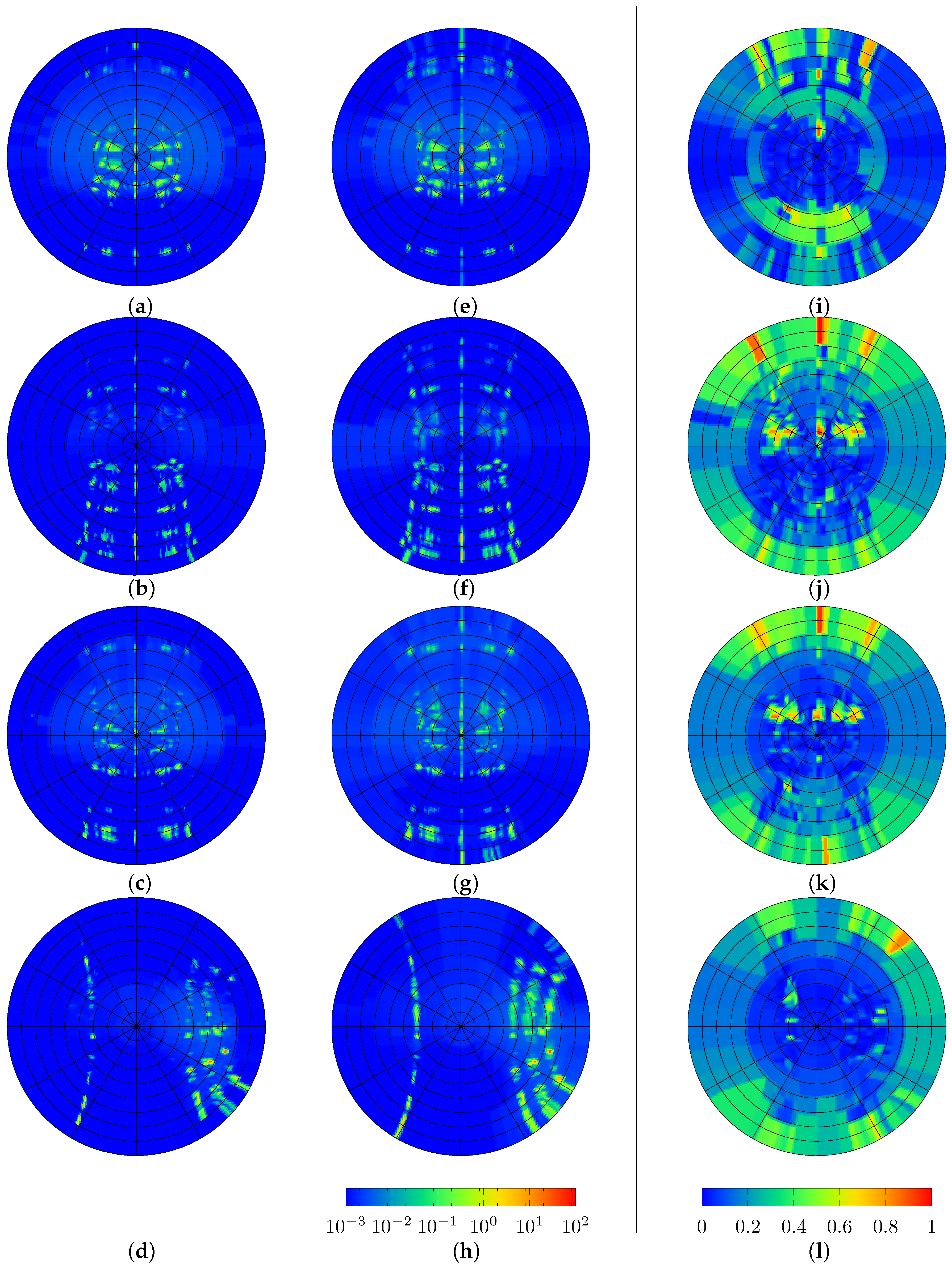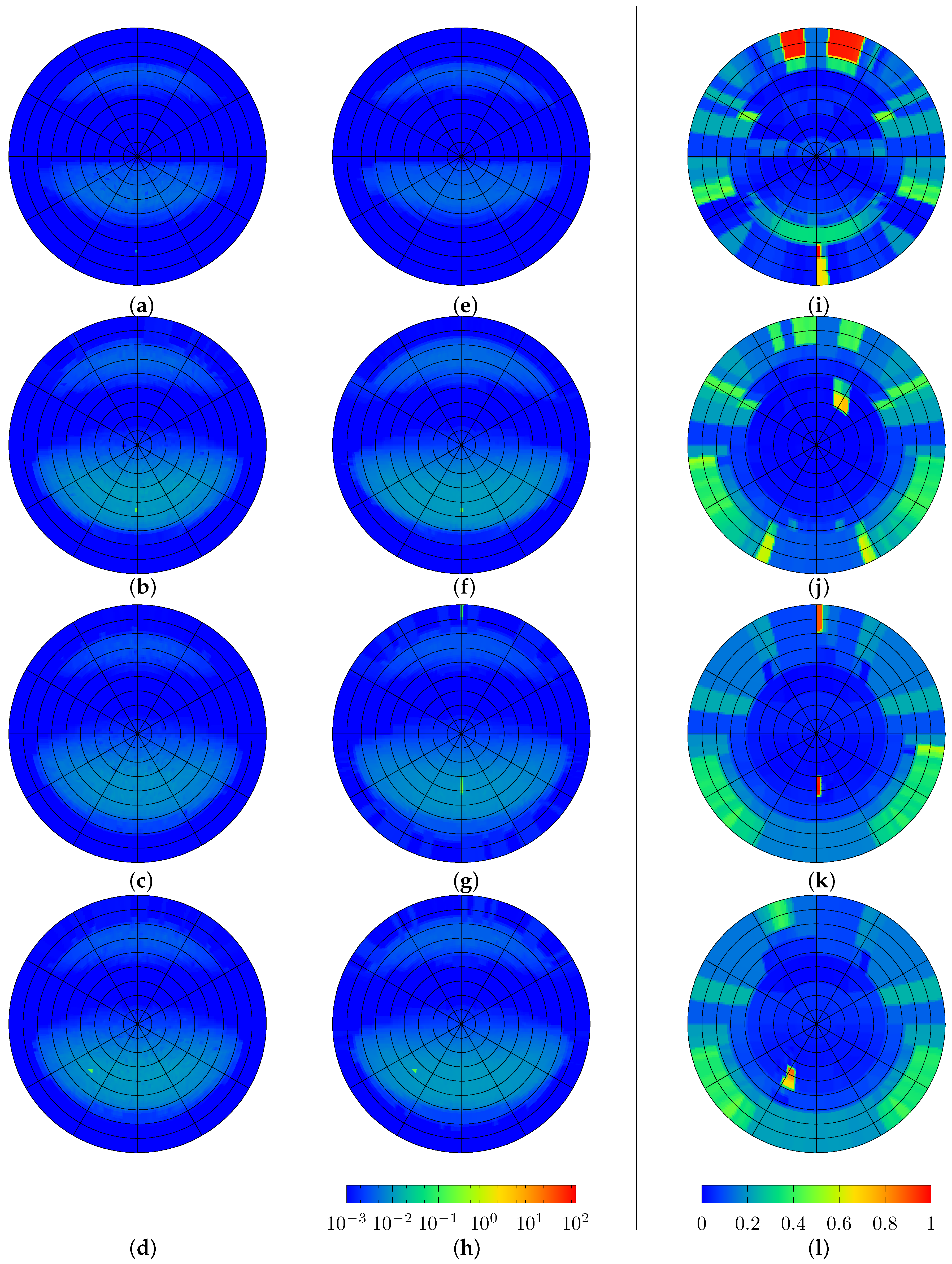 CFS2: Transmission based on ray-tracing ((a) to (d)) and matrix formalism ((e) to (h)). of resulting distributions ((i) to (l)). Incident directions from top to bottom: (a,e,i), (b,f,j), (c,g,k) and (d,h,l).