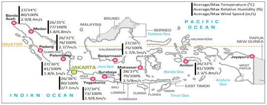 Indonesia is a tropical country located between 6°08′ N–11°15′ S and 94°45′–141°05′ E. It has only two seasons each year, a dry and a wet season. Data gathered from Green Building Studio (Autodesk) [1] showed that the average and maximum outdoor temperature are 26 °C and 37 °C, respectively, while the average relative humidity ranged between 73% and 100% (Figure 1) [2]. The wind speed varies between 0.3 and 8.6 m/s. Most of the Indonesian regions experience rainfall between 1000 and 4000 mm/year. The climate is generally hot and humid with only a small variation of temperature throughout the year.