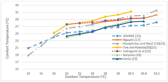 In Figure 3, the adaptive models by Nicol and Humphreys (when the outdoor temperature is above 20 °C), Toe and Kubota, Indraganti and Nguyen predict higher comfort temperature compared to the ASHRAE standard. This fact is like stating that people in hot and humid countries, where they are exposed to an outdoor temperature usually above 20 °C, tend to have a higher preferred temperature than the other climates, which have lower outdoor temperatures. On the other hand, the adaptive models by Karyono and Santy are much closer to ASHRAE, and these lines predict the same comfort temperature as the outdoor temperature around 27 °C. The interesting point is that when the outdoor temperature is below 27 °C, these models predict lower than the ASHRAE standard, but in contrast, they predict higher when the outdoor temperature is above 27 °C.