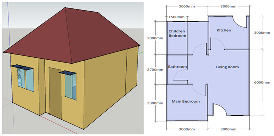 A typical residential house to investigate the performance in the house is shown in Figure 7, and the house is set for four family members and has a total floor area of 54 m2. It has two bedrooms (one main bedroom and one child’s bedroom, one kitchen, one living room and one bathroom). Materials and the properties for the house envelopes are present in Table 16. The electrical appliances used frequently by the occupant including time usage needed for the simulation are presented in Table 17. The energy simulation is limited to a free running house without an air conditioner because the final aim of this research is to design the passive house in Indonesia. The weather data used for the simulation are hourly data for Jakarta gathered from Green Building Studio [53]. The house is in the north direction, and the air change rate is set as 1/h.