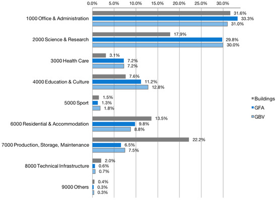 The building stock of Bavaria (Figure 2) analyzed in this study consists of nearly one-third office and administrative buildings, including court and parliament buildings. This group also leads in terms of the gross floor area (GFA: 33.3%) and the gross building volume (GBV: 31.0%). Group 7000, buildings for production, storage, and maintenance, and group 6000, residential and housing buildings, represent a higher percentage of the total number of buildings, but a comparatively lower percentage of the total GFA and GBV. These building types are comparatively small-scale and small-volume. Buildings for science, teaching, and research, as well as for health, lie on the opposite end of the spectrum. They represent a very high percentage of the GFA and the GBV, relative to the number of buildings. These buildings are disproportionately large on average. The differences within group 4000, buildings for education and culture, in terms of numbers, GFA, and GBV, are similar to groups 2000 and 3000, but are not so extreme.