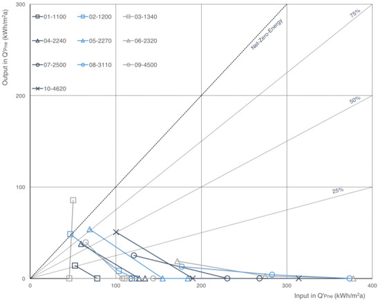 When considering the overview of all of the data series of the ten case studies (Figure 5), differences between the individual results can be recognized. The greater the distance between the right data point (RB according to EnEV 2013) and the left data point (nZEB 2021) of a row, with respect to the x-axis, the higher the absolute reduction of the Q’PNE (Δx).