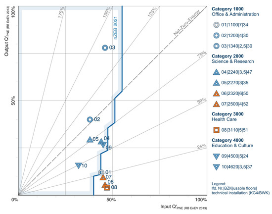 The reference value is always the Q’PNE of the reference building, according to EnEV (100%). The value Q’PNE represents the percentage variation in primary energy use and is an indicator of the overall efficiency of the building operation. This value is reduced by increasing the building’s self-consumption of renewable energies (lower input value on the x-axis). The output (y-value) is increased by increasing the energy supplied to the grid. If the output exceeds the value of the input (angle bisector), then the building meets the net zero energy standard. Since meeting this standard is not required for nZEB, a lower degree of coverage (allowing the energy demand to be compensated by grid feed) could provide a definition for nZEB. The purpose of the case studies is to analyze this option.