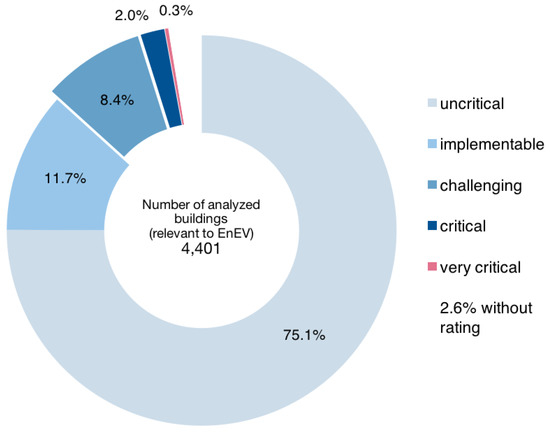 Figure 8 shows the results: According to this evaluation, 86.8% of the new buildings from 2021 onwards can be considered as uncritical and implementable, with regard to the above-mentioned nZEB Standard 2021. A total of 8.4% of new buildings can be considered challenging, and 2.3% critical or very critical. This also includes all three case studies (06, 07, and 08) that did not reach the defined minimum energy standard.