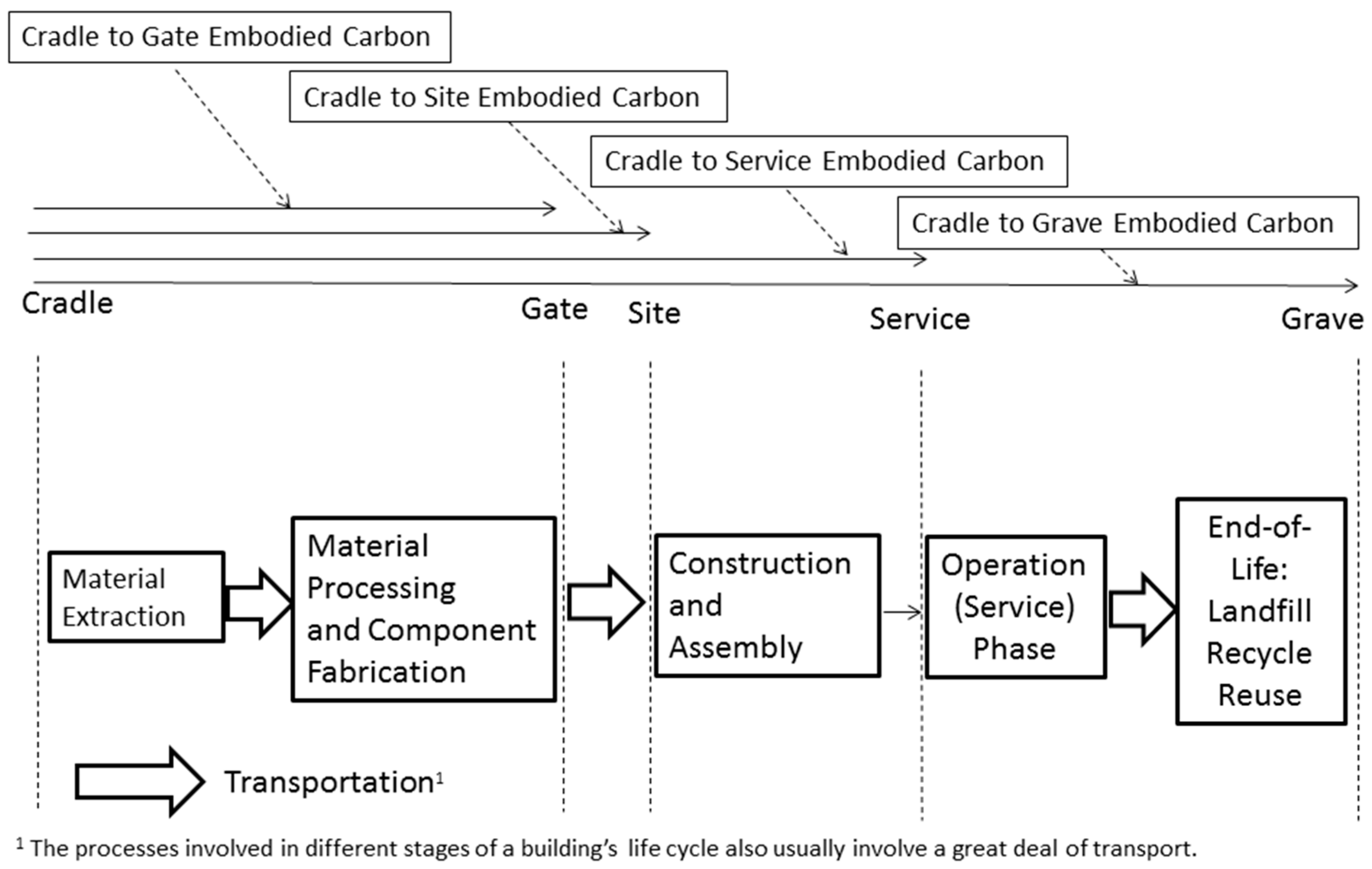 The energy use and carbon emissions occur in all different stages of a building’s life cycle, which may be defined as (I) material extraction; (II) material processing and component fabrication; (III) construction and assembly; (IV) operation and service phase; and (V) end-of-life phase (Figure 1) [6]. Furthermore, the transition between these phases generally involves considerable transportation-related emissions, which should be considered in the estimation of the carbon footprint. In another particular categorization, carbon emissions may be divided into two general groups, embodied carbon and operating carbon emissions. The operating carbon comprises of carbon emissions incurred during the service life of a building and includes the carbon emissions incurred in maintaining the indoor environment through processes such as heating, cooling, lighting and the operation of appliances [7]. The embodied carbon, on the other hand, has been conventionally defined to comprise carbon emissions incurred in stages I to III of the building’s life cycle (defined above), although it may be extended to include the end-of-life carbon emissions. As shown in Figure 1, to clarify the life cycle phases considered, the embodied carbon may be reported as “cradle to gate”, “cradle to site”, “cradle to service” or “cradle to grave” embodied carbon, which respectively comprise emissions incurred up until the onset of Phase II, Phase III, Phase IV, and Phase V of a building’s life cycle, alongside the corresponding transportation emissions.