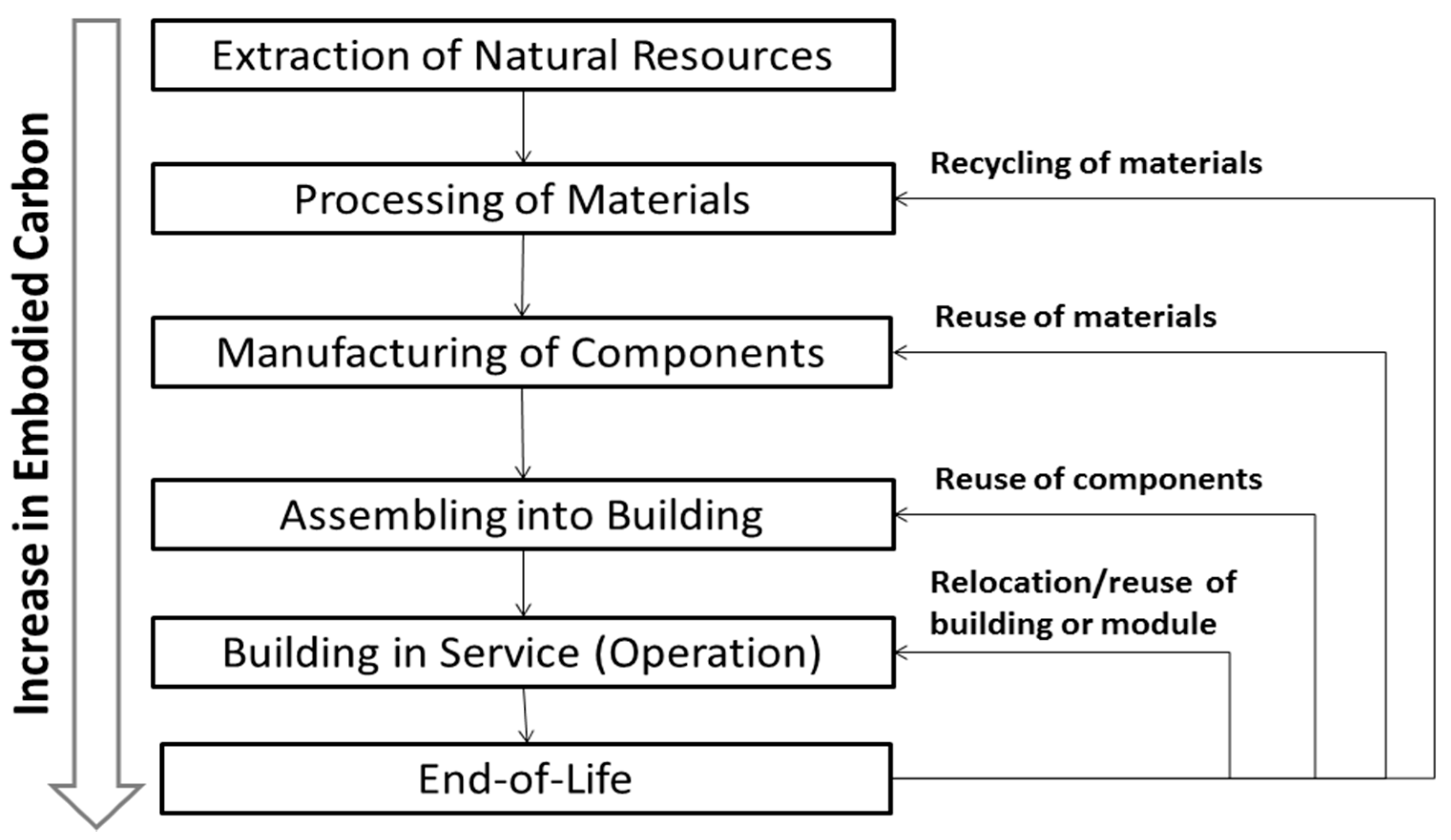 Reuse of materials and components has been highlighted as an effective alternative end-of-life strategy to preserve materials, as well as some or all of the costs, energy and embodied carbon invested into the structure [22,91]. The technical aspects, benefits and costs of reuse of materials and building components, through design for disassembly/deconstruction, have been widely studied in the available literature [92,93,94,95]. If designed properly, many of the elements used in a typical building could be in good enough condition, at the end of the service life of the building, to be reused for similar or other applications [78,91,96]. As shown in Figure 2, reuse of components not only can preserve the energy, carbon and capital initially invested into making the components but also preserves the materials used. Akbarnezhad et al. proposed a framework to estimate and compare the embodied carbon of designed for disassembly concrete buildings with that of buildings designed using conventional concrete elements. The authors indicated that a similar methodology can be used during the design phase to compare the effects of various end-of-life strategies on a building’s embodied carbon.