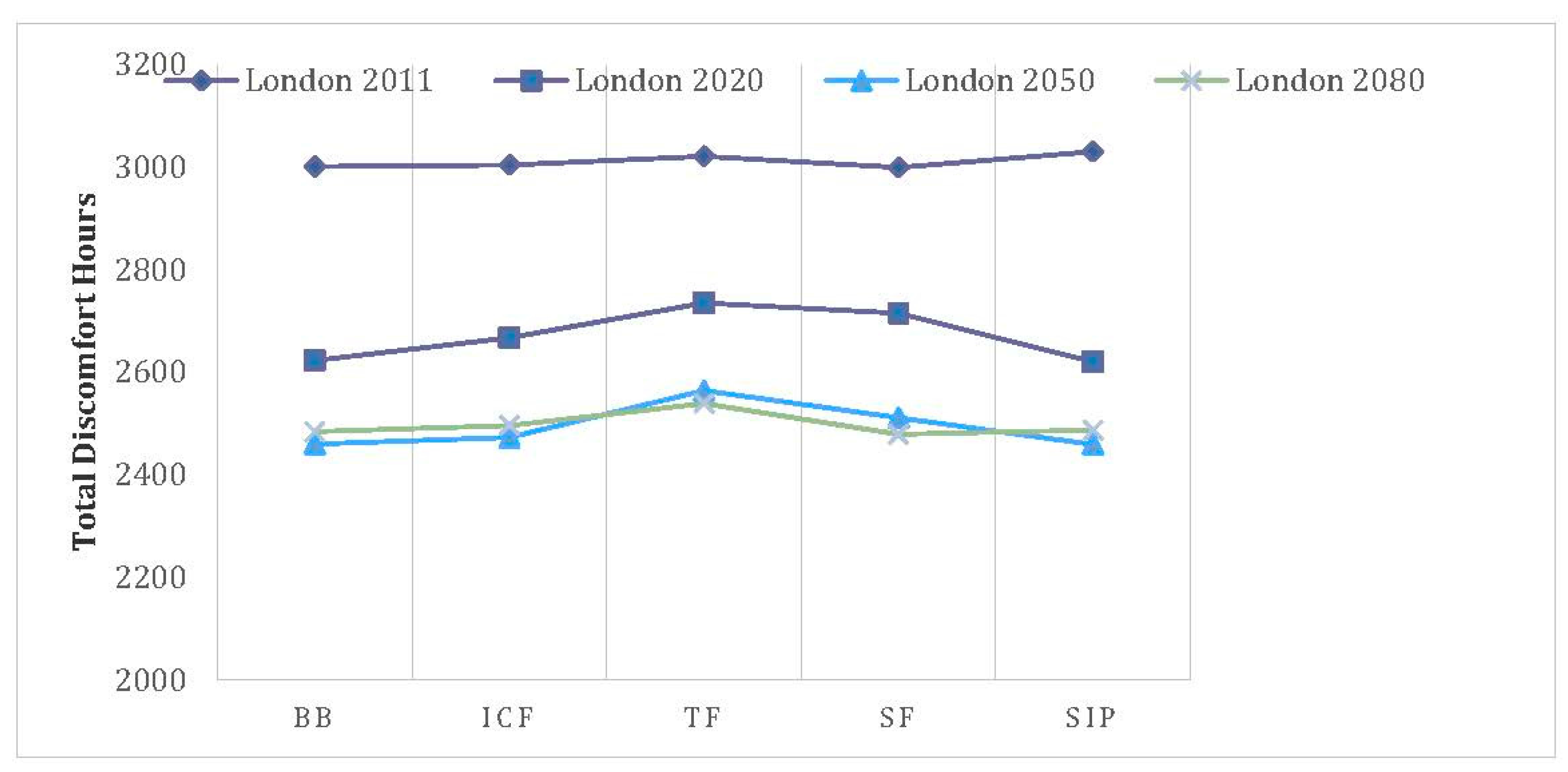 - A high level of thermal mass shows minor advantages in most cases for a typical flat model. This result is comparable to the Three Regions Climate Change Group (TRCCG) studies, which undertook similar research for 1960s houses and flats in London, and the east and southeast of England. They found that ventilation use, solar control, cooler floors, etc., were the most effective strategies to improve comfort in the UK housing [29].