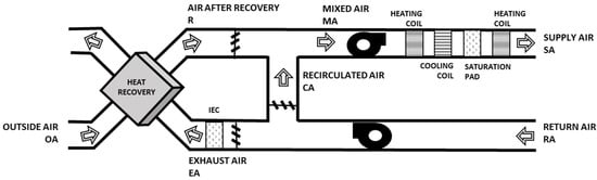 A typical configuration has been considered for the Air Handling Unit AHU (Figure 1), consisting of a set of heating/cooling and dehumidification, humidification, and reheating coils to achieve the required supply air (SA) condition. The return air (RA) of the space is separated into a recirculated (CA) and an exhausted part (EA). The latter one is used for preconditioning the outside air (OA) within the heat recovery (HR) device. After leaving the HR, the recovery air (R) together with the CA are mixed (MA) and sent to the AHU coils.