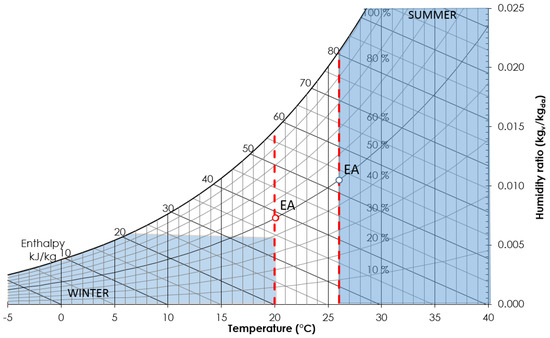 In Equations (7) and (8) is the Specific Latent Load (SLL). Its value can be defined directly from the activity level of occupants within a conditioned space, without taking into account other building or occupation characteristics. Assuming for instance the values suggested by the technical standard ISO 7730 [13] (Table 1) for the latent load per person and the minimum fresh air rate per person as from the Italian national standard UNI 10339 [14], SLL can be determined for various activity levels. Five SLLs have been considered in this study to discriminate between typical rest or moderate activity levels: 0.8, 1.2, 1.6, 2.0, and 2.4 gv/kgda.