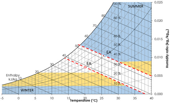 In addition, since SHR allows for indirect evaporative cooling (IEC) of the EA [15] before entering the device (Figure 1), the reference cases considered in summer mode operation are: SHR + IEC, and THR with no control strategy (case A) and with control strategy to avoid excessive humidification and maintain the indoor relative humidity at 50% (case B).