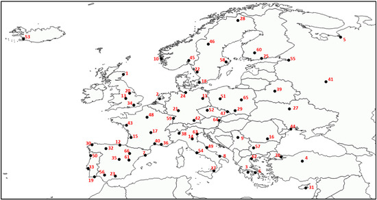 Map of Europe with the 66 considered cities. Numbers correspond to Table 2.