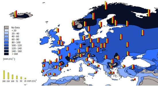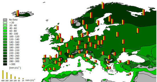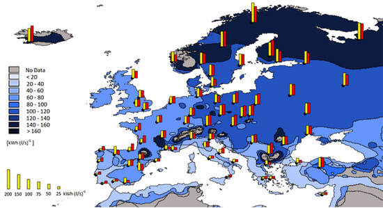 Table 3. Price for electricity [EUR/kWhel] and natural gas [EUR/kWh] for the main countries. - In order to calculate the economic performance indicators, i.e., simple payback time and net present value, the investment cost per flow rate has been determined based on the price list for the performance of public works and maintenance of the municipality of Milan [26] as 0.7 EUR/(l/s) for SHR and 2.3 EUR/(l/s) for THR. The calculation of the net present value assumed, according to the EU Commission Delegated Regulation 244/2012 [27], a lifespan of 15 years, a real discount rate of 3%, and annual maintenance costs of 4% of the investment.