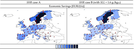 The winter seasonal cost savings have been determined country by country, since the prices for natural gas depend on the national energy market. Applying strategy A, the lowest beneficiary of SHR is found for Greece as a state (3.57 EUR/(l/s)), while Messina is still the least convenient (2.68 EUR/(l/s)) city. Sweden shows the highest average saving especially in Kiruna with (22.99 EUR/(l/s)). The impact of increasing SLL on the cost savings is in line with the reduction of the energy savings. The cost savings of Portugal, the Netherlands, and the United Kingdom are the most affected by applying the control strategy B with a reduction of 3.30, 2.74, and 2.28 EUR/(l/s) for a SLL of 1.6 gv/kgda. In summer mode, the largest cost savings are for Greece, Spain, Italy, Portugal, and France, respectively, with 0.37 ± 0.11, 0.34 ± 0.31, 0.28 ± 0.11, 0.18 ± 0.12, and 0.10 ± 0.07 EUR/(l/s). For Germany, Finland, Norway, the Netherlands, Poland, Sweden, and the UK the cost savings amount to less than 0.10 EUR/(l/s).