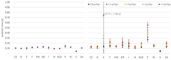 The annual cost savings for the control strategy A lead to a simple payback time for the THR device for all considered SLLs and all countries that is lower than 5 months. The impact of the effectiveness control by strategy B is shown in Figure 12. Again, the device’s payback time is the lowest in Sweden with less than a month for all SLLs. In Spain, Portugal, and Greece the payback time is the highest. The various climatic conditions of the considered cities in Spain cause (especially for a SLL of 2.4 gv/kgda) an extremely high payback time of 27.2 a and standard deviation 76.1 a.