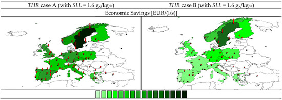 Total cost savings by case A (left) and case B (right) with SLL = 1.6 gv/kgda, for THR. The 16-color scale ranges from less than 2 EUR/(l/s) to more than 30 EUR/(l/s) in steps of 2 EUR/(l/s).
