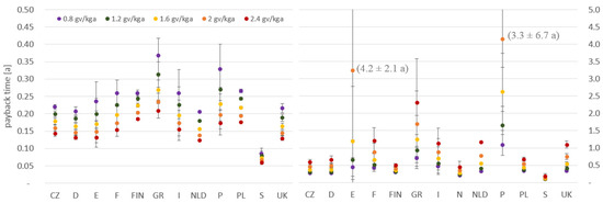 Payback time for the SHR device for control strategy A (left) and B (right).