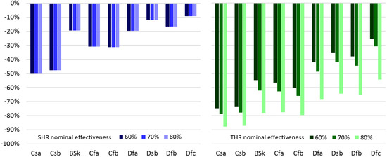 First, the calculations have been also repeated for nominal effectiveness of 60% and 80%. Figure 13 shows the reduction in the energy savings caused by control strategy B with respect to control strategy A for winter mode and a SLL of 1.6 gv/kgda. For the SHR, control strategy B by-passes the HR device for certain air conditions, independent of the effectiveness. For that reason, there is no difference in the savings reduction. On the contrary, the impact of the control strategy B on the energy saving potential by THR is increasing for higher total nominal effectiveness. While for Csa, the decrease is only 13% passing from a nominal effectiveness of 60% to 80%, and is 29% for Dfc, which leads to more than a double-fold reduction of potential energy savings if control strategy B is applied. This trend can be explained by observing that the partialized area, in orange in Figure 3, becomes larger with increasing effectiveness. For the summer mode, variations lower than 1% have been found.