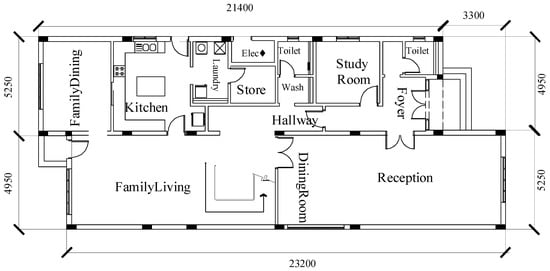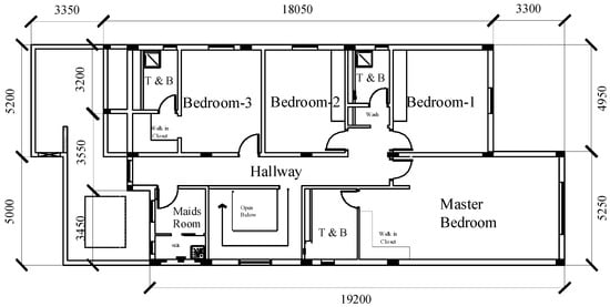 A four-bedroom single family faculty residence at King Fahd University of Petroleum & Minerals (KFUPM), Saudi Arabia, depicting the modern regional building design trends was used in the study (See Figure 1 and Figure 2). A base case simulation model of the house was developed using DesignBuilder, which provides a graphic user interface. Since DesignBuilder uses EnergyPlus as its simulation engine, the authors assume the same balance equation as mentioned by []. The workflow starts with the selection of the proposed location for the analysis. Then, the tool allows the creation of the building’s geometry and other defined parameters such as internal loads, construction types, windows, doors, lighting, material selection, and HVAC systems. Table 1 shows the summary of construction features of each thermo-physical system. In addition to these, emphasis is also given to infiltration in terms of airtightness depending on the number of openings, and organization and usage of the house. The airtightness in DesignBuilder is expressed in terms of a constant rate air changes per hour (ACH) schedule. Each floor has been assumed to have different levels of airtightness. Though the standard value these days for airtightness has been adopted as 0.5 ACH, the same could not be observed in the case of the base model development. As the lower level has many openings in comparison to the upper one, the airtightness is assumed to be 1 ACH and 0.5 ACH respectively.
