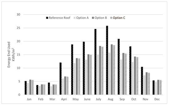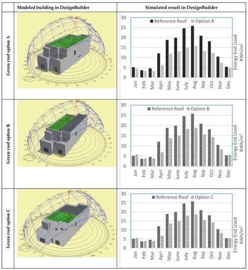Figure 5 summarizes the results of the simulated energy performance of the base case model and the green roof options. It can also be observed that energy consumption increases in April, May, June, July, August, September, and October due to increasing solar radiation in these months. The total yearly energy consumed by the base case model (without the vegetative layer) is 169.2 kWh/m2 per annum, while green roof option A gives a total annual energy consumption of 110 kWh/ m2 and, thus, a reduction of 35%. The Option B consumes a total energy of 126 kWh/m2 per year with an estimated energy reduction of 25%, while the option C consumes a total energy of 128 kWh/m2 annually and, thus, an energy reduction of 24%.