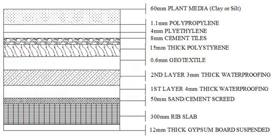 A cross section of the green roof components has been shown in Figure 4. The performance of this green roof was compared against that of the conventional roof through a simulation analysis. It is noteworthy that values for some of these parameters have been adopted from literature for validation of the base model, as shown in Table 3.