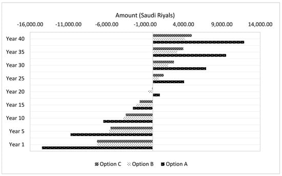 As shown in Figure 6, the results of an economic assessment employing the NPV approach show that all assessed green roof options have their NPVs less than zero until the end of the 19th year. At the end of the 20th year the NPV of all the options becomes positive, but only the option A at the 40th year shows a significant numerical value. Thus, it can be concluded that the benefits will only be fully achieved towards the end of the life cycle of the building. The results, therefore, suggest that the green roof technology, as a potential energy conservation strategy, is not an economically viable option. This can be attributed to the subsidized tariff rates for electricity in Saudi Arabia.