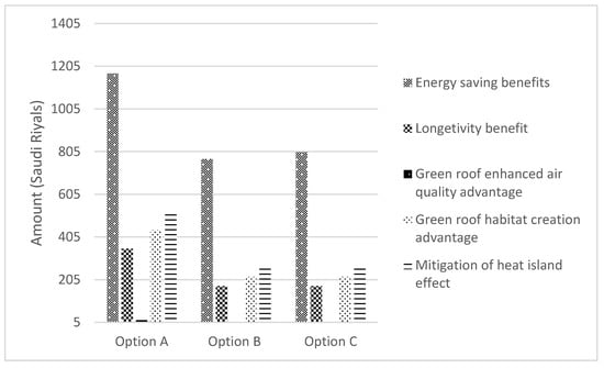 The average electricity tariff rate is about $0.03 kWh for residential buildings [], which is low when compared to other countries. However, Saudi Arabia has plans to remove this subsidy. It is envisaged that the subsidy removal will be implemented in 2020. This envisaged rise in electricity tariffs will catalyze a rapid adoption of Energy-saving strategies such as green roofs. It will also improve the economic viability of such energy conservation strategies. Additionally, the green roof concept provides environmental benefits such as: reduction of urban heat island effect; sound absorption; capture of CO2; and mitigation of air pollution. Such environmental benefits will increase the total quantifiable benefits of the green roof concept as indicated in Figure 7. The green roof concept can further be enhanced through botanical and horticultural studies on the various kinds of plants that are more conducive to the Saudi Arabian environment and will require little or no maintenance, hence a reduction in cost outflows. It is also noteworthy to mention that green roofs is one strategy that can be employed for energy conservation in buildings.