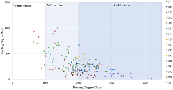 Classification of nZEBs by countries, according to HDD (15 °C) and CDD (18.5 °C). Definition of three winter rigidity levels (warm HDD15 < 1000; mild 1000 ≤ HDD15 < 2000 and cold HDD ≥ 2000). Note: one point can include more than one building, because one point represents a location.