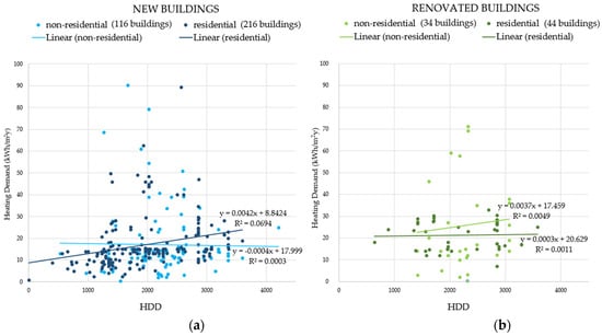 Heating demand of nZEBs in relation to the use of the buildings, as well as the construction type, new buildings (a) and renovated buildings (b) according to HDD (15 °C).